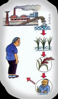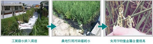 | (一)農地: 因區域排水系統未臻完善,工廠廢水及家戶生活污水排入河川或灌溉水渠道中,再被引進農田做為灌溉之用,部分農地因長期引用受污染灌溉水源,使農田土壤或食用農作物重金屬含量過高。 ![]() |